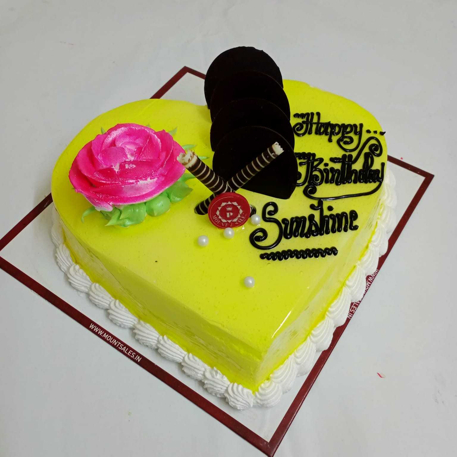 Product Details: Cake Flavor- Pineapple Type of Cake - Cream Weight- 1kg Shape- Heart Note: If you need more than 2kg cakes you can call to our customer care number-( Between 11Am to 8Pm) *For English- 63 66 22 66 73 *For Hindi- 63 66 22 66 76 *For Malayalam- 63 66 22 66 74 *For Kannada- 72 04 98 49 17 Please Note: •The cake stand, cutlery & accessories used in the image are only for representation purposes. They are not delivered with the cake. •This cake is hand delivered in a Food Grade cardboard box Care Instructions: * Store cream cakes in a refrigerator. * Slice and serve the cake at room temperature and make sure it is not exposed to heat. * Use a serrated knife to cut a fondant cake. *The cake should be consumed within 3Days. Enjoy your cake!